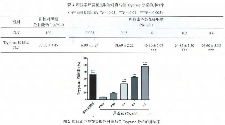 此外,针对因接触致敏成分而引起的瘙痒或红肿,该成分也表现出积极的舒缓特性。在斑马鱼过敏模型中,库拉索芦荟花提取物可抑制类胰蛋白酶的释放(该物质与过敏反应相关),尤其在0.1%–0.4% 的浓度区间内效果较为明显,整体性质温和,不易增加皮肤负担。