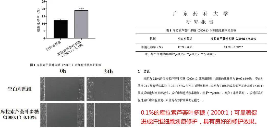 与修护相关:在细胞迁移实验模型中,添加该原料的组别显示有助于促进成纤维细胞的迁移。